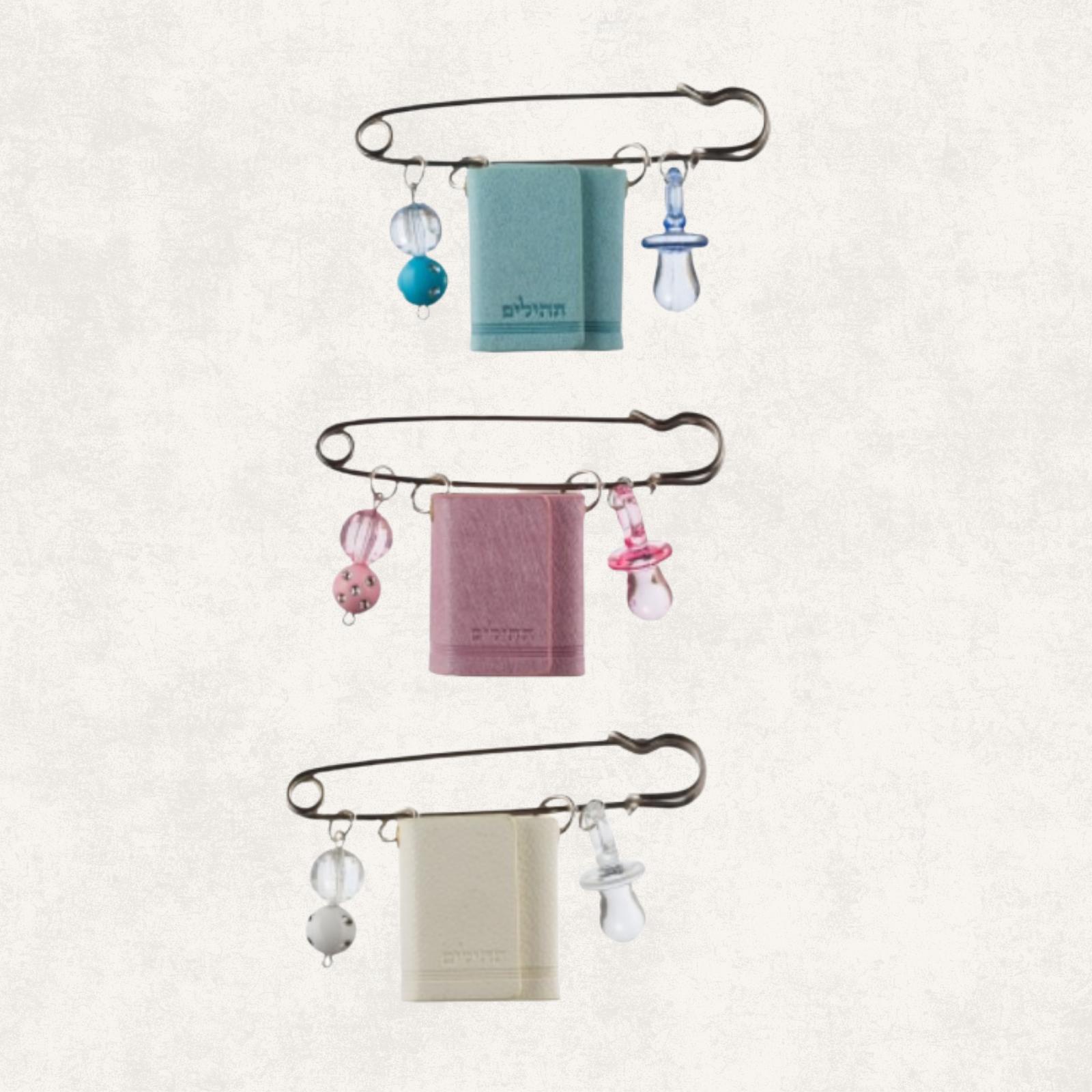 A delicate baby pin adorned with a mini Tehillim booklet and protective charms. Offered in blue, pink, or white, this piece is a thoughtful gift for Brit Milah, Simchat Bat, or a newborn.