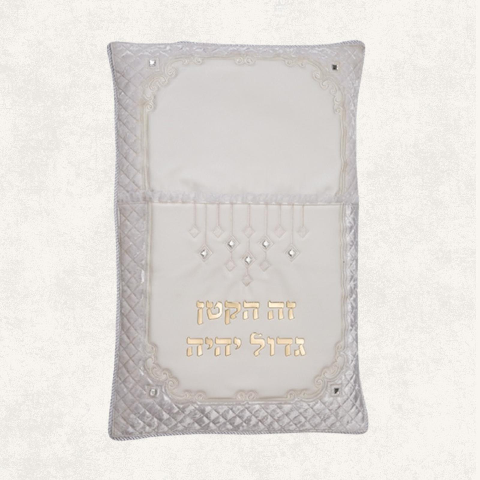 Crafted in soft white fabric with quilted detailing and silver embellishments, this pillow is both functional and ceremonial — a timeless piece that can be cherished as a family keepsake long after the Brit Milah.
