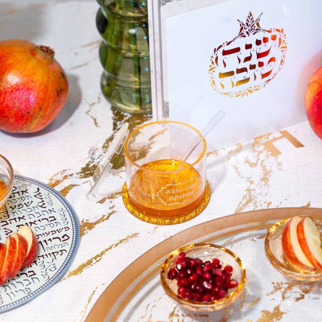 Bring timeless elegance to your Rosh HaShanah table with this Transparent Honey Bowl with Gold Accents. Crafted with a crystal-clear body and a lustrous gold-toned base, it includes a matching lid and spoon for a refined serving experience. The Hebrew engraving adds a meaningful touch, making it both a practical and symbolic centerpiece for your holiday celebrations. Perfect for gifting or enhancing your own festive table, this honey bowl captures the essence of old-world charm with modern sophistication.